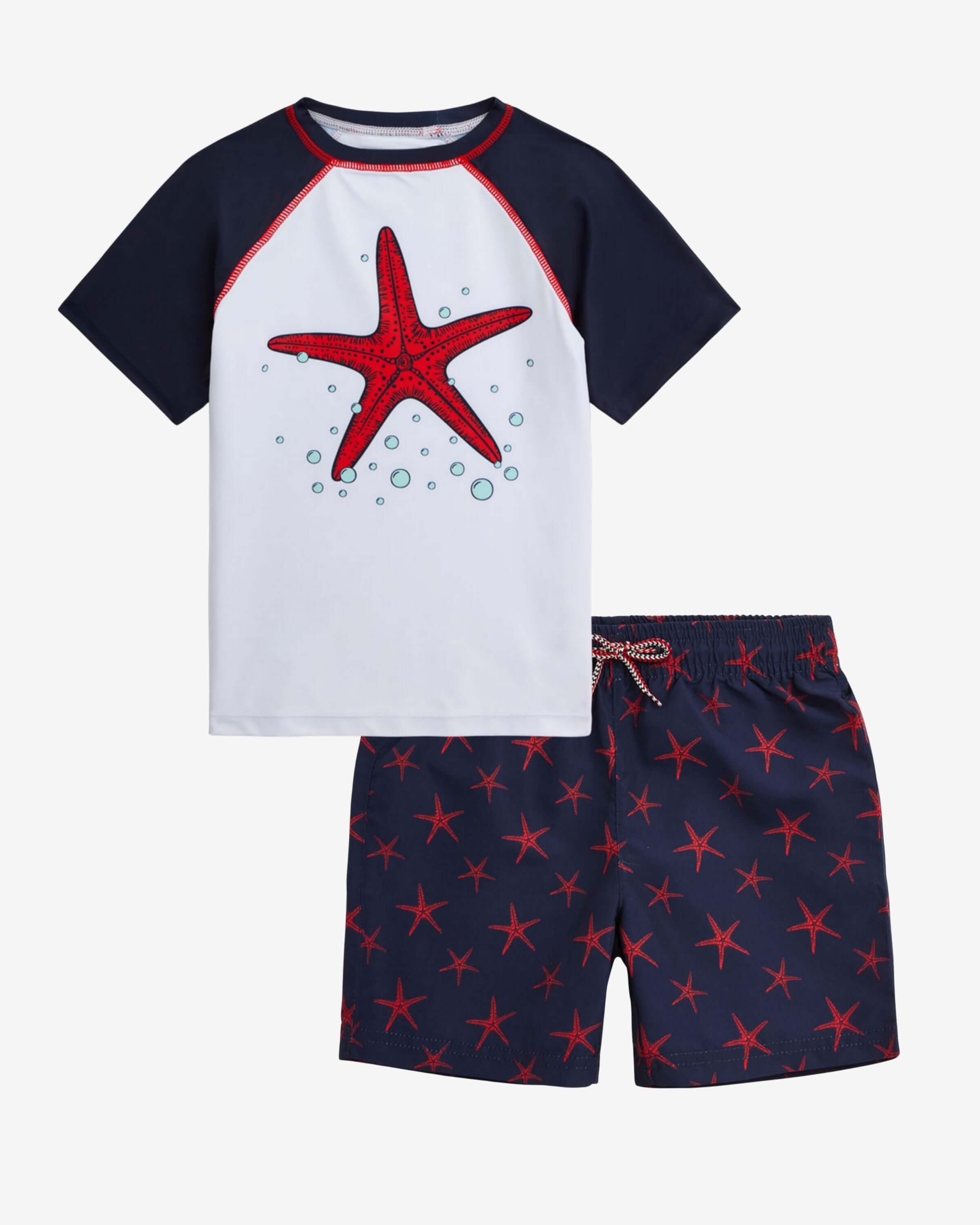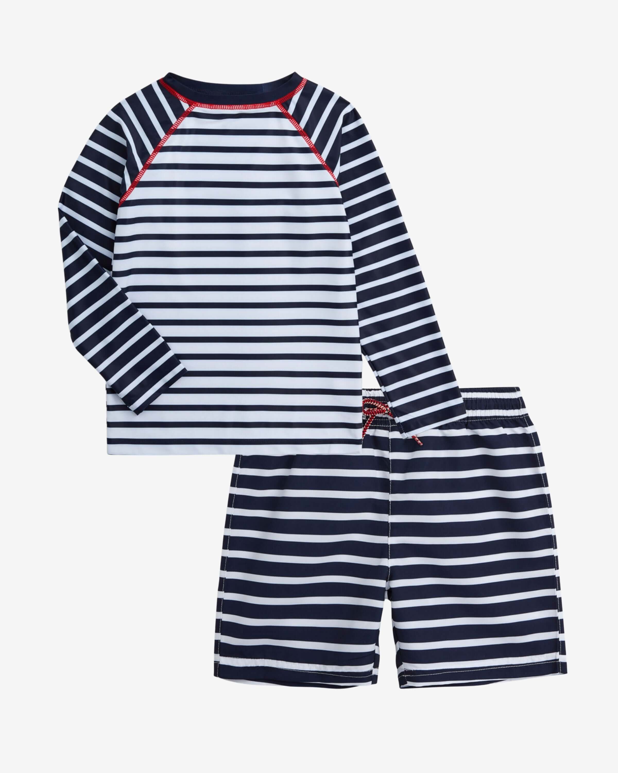 Swim Sets: Coordinated trunks and rash guards for effortless style.