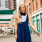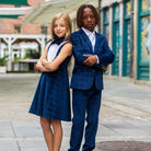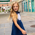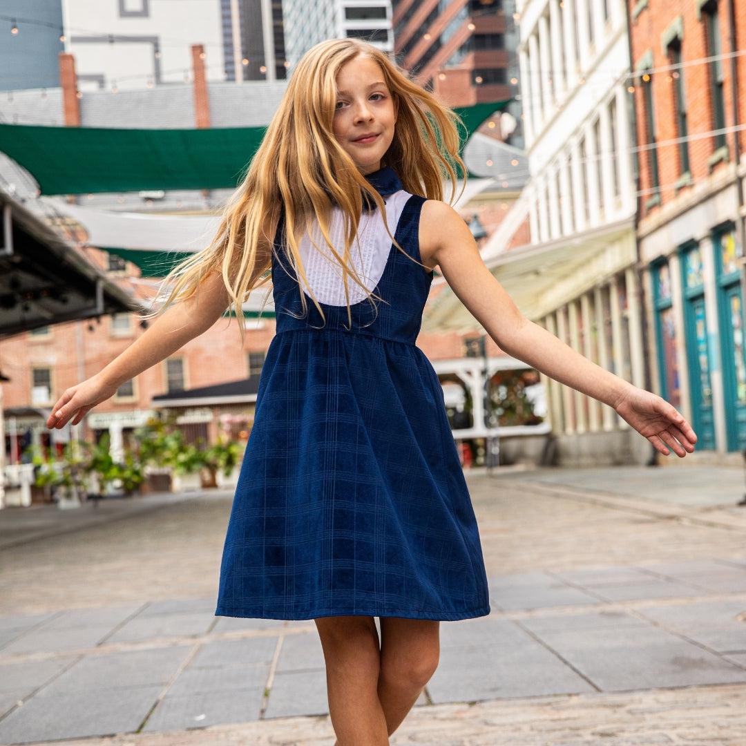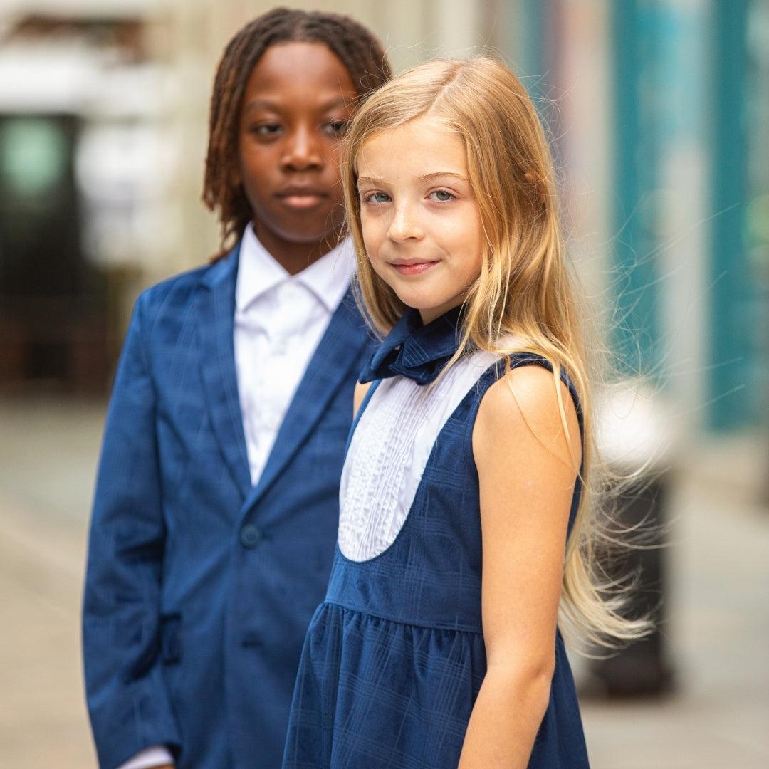 Our best selling tuxedo dress has returned in a web-exclusive, beautiful blue velvet windows pattern to coordinate with our boys' tailored suit.