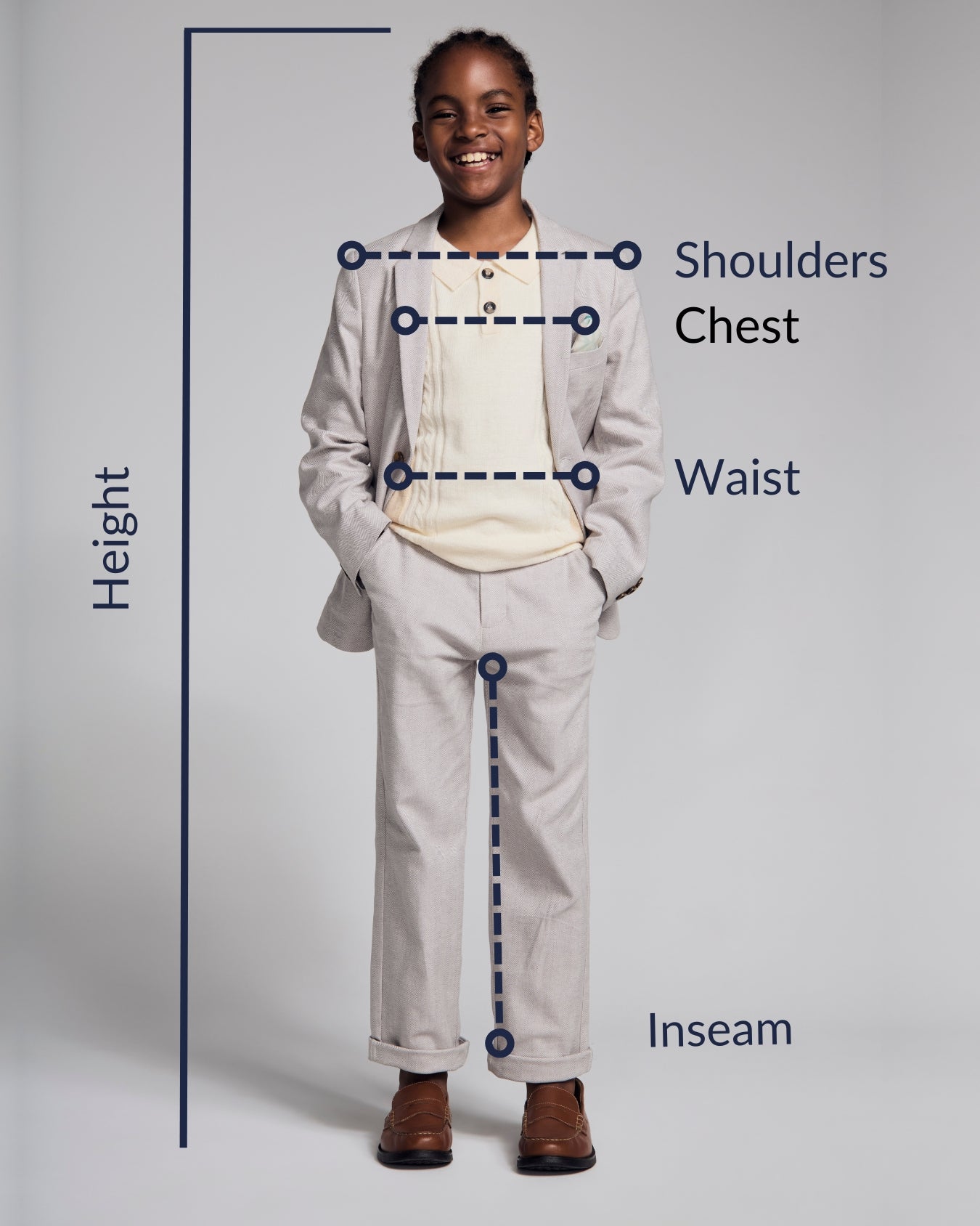 Find the perfect fit for your little gentleman with our boys suiting size chart, tailored to help you suit him up in style and comfort.