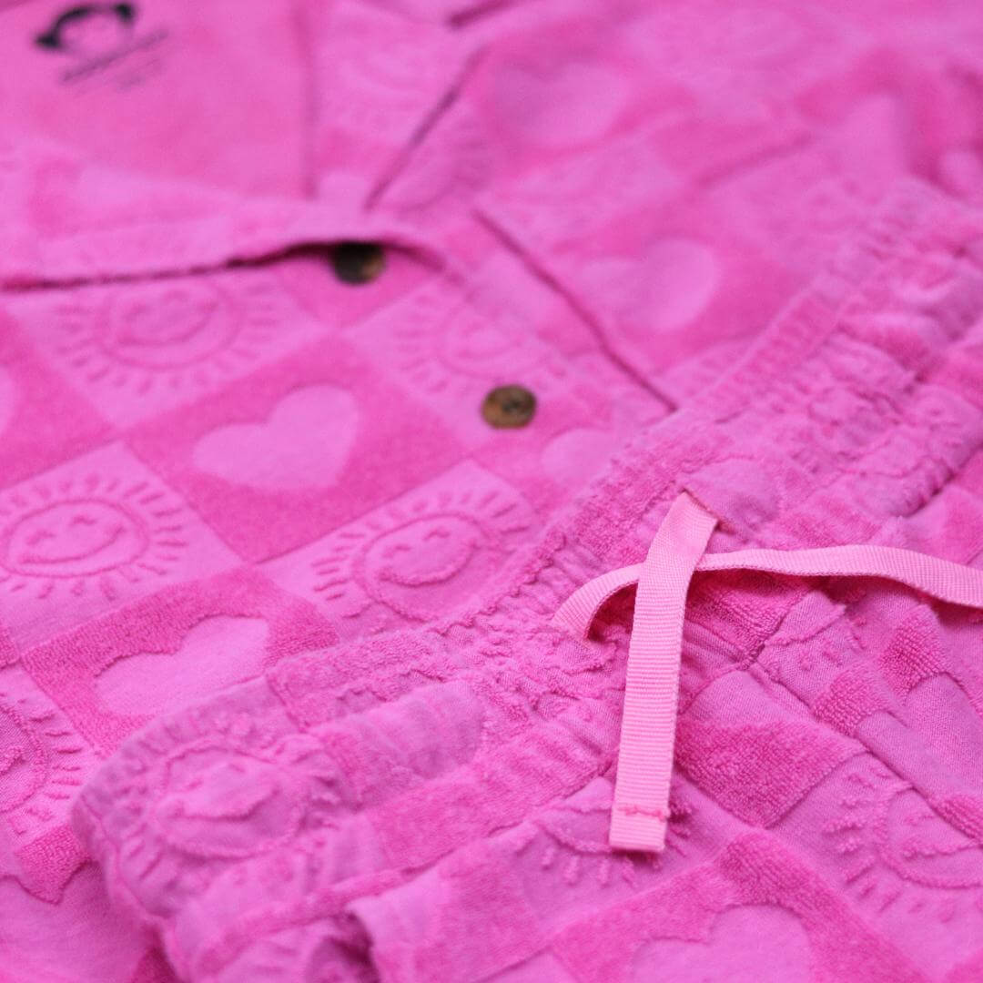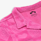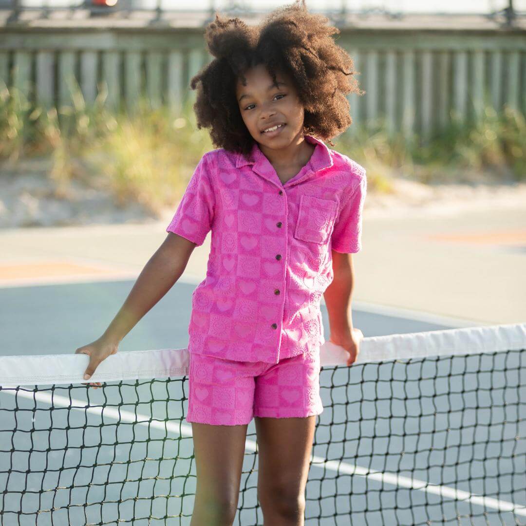 Brighten up her wardrobe with our charming pink resort shirt adorned with playful heart patterns! Crafted from high-quality, breathable fabric, it offers all-day comfort and style. Perfect for sunny days at the beach or casual outings, this versatile piece pairs effortlessly with shorts or skirts, making it a must-have for every little trendsetter! Pair with the Girls Resort Shorts in Fuchsia to complete the matching set!