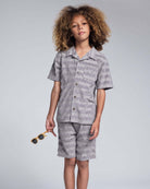 Meet the Grey Terry Resort Set, a warm-weather matching set that keeps kids cool, comfy, and effortlessly put together. The Grey Resort Shirt features a classic collared neckline, short sleeves, and button-front styling, finished with a textured fabric and chest patch pocket for a polished touch. Paired with the Grey Resort Short, this bundle is built for all-day play with an easy pull-on fit, functional drawstring, and front and back pockets for little essentials. The textured fabric and subtle allover print give this set relaxed summer style parents love and kids can move in from morning to night.