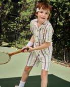 The Painter's Stripe Resort Short is made for easy summer days and nonstop play. This pull on style features a functional drawstring for a comfy, adjustable fit. Front and back pockets keep treasures close. Lightweight and effortless, these kids resort shorts are perfect for vacations, weekends, and warm weather adventures. Pair with the Painters Stripe Resort Shirt to complete the matching set.