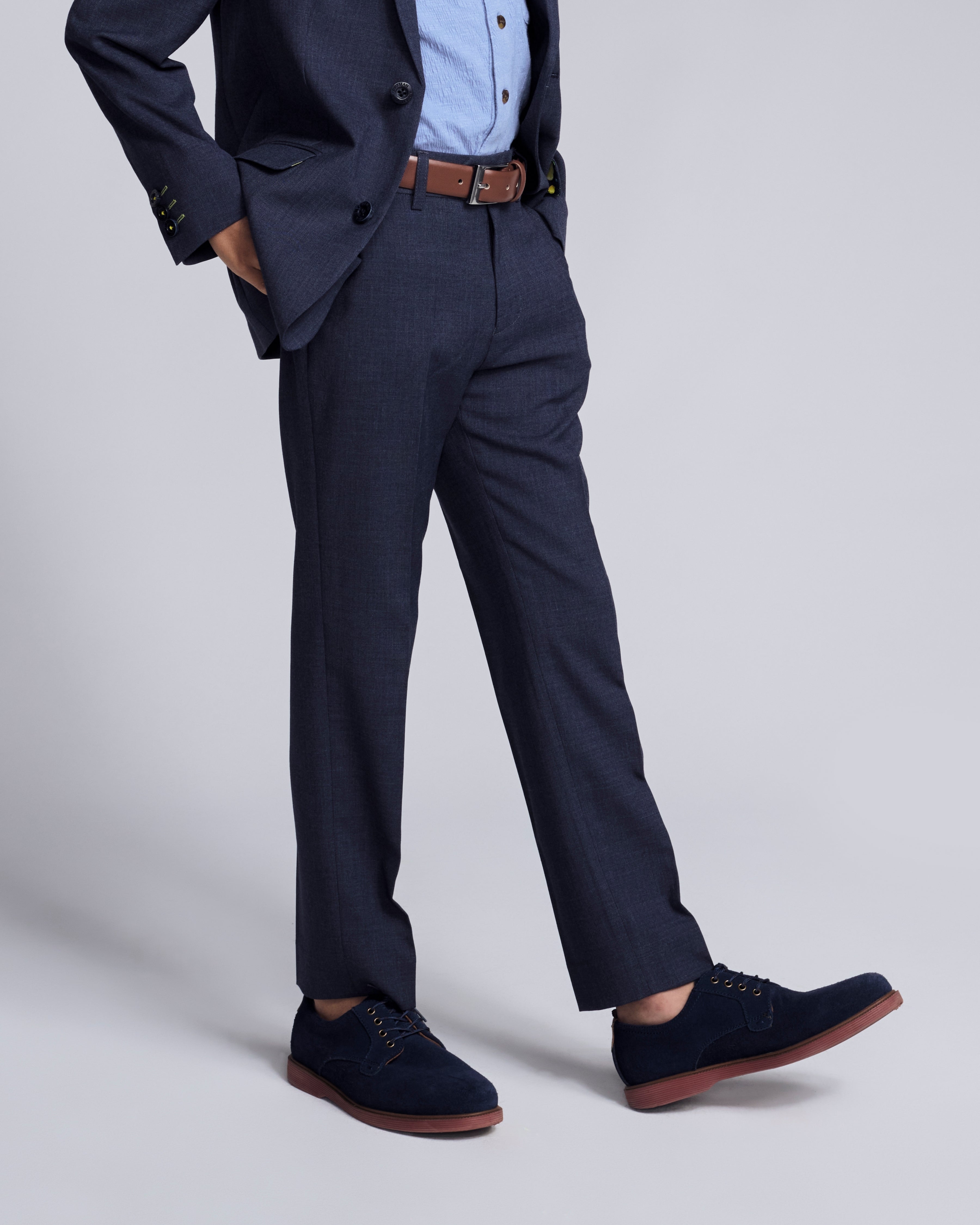 The Peacoat Stretchy Mod Suit Pants deliver a sharp look with kid-approved comfort. Designed in a skinny-leg fit with stretch for easy movement, it features an adjustable waist with snap and zip, belt loops, two front pockets, and two back button pockets. A polished staple parents can count on for any dressed-up moment. To complete his look, check out our matching Stretchy Mod Suit!