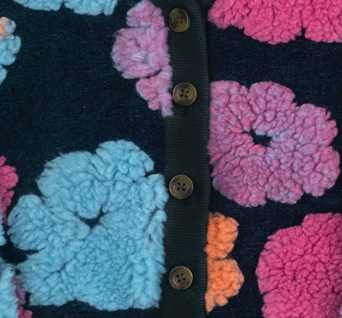 Introducing our Girls' Raya Cardigan Set, a cozy black layer adorned with a pink undershirt and vibrant fuzzy flowers in pink, blue, and orange. Crafted for comfort and style, it adds a playful touch to any outfit. Perfect for a statement-style piece.